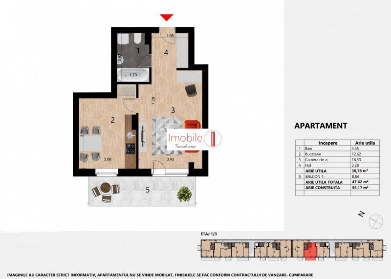 Apartamentul propus este disponibil la etajul 2 sau 3, fiind compus din living, bucatarie, 1 dormitor, 1 baie, 1 balcon, avand o suprafata construita de 55 mp.